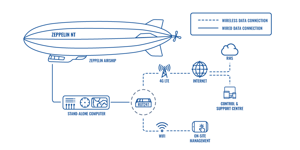 ツェッペリンNT飛行船のいくつかのシステムは、それが駐機場所にあるとき、地上で制御および監視する必要があります。これは、RUT241を内蔵したEEPS-IIDスタンドアロンコンピュータシステムを採用して、制御およびサポートセンター、オンサイト管理システムおよびテルトニカのリモート管理システム(RMS)に接続することによって達成されます。